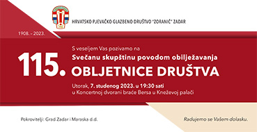 Na sam Dan grada Zadra i blagdan sv. Krševana, 24. studenog 2021., pjevački zbor Hrvatskog pjevačko glazbenog društva "Zoranić" održat će Svečani godišnji koncert...
